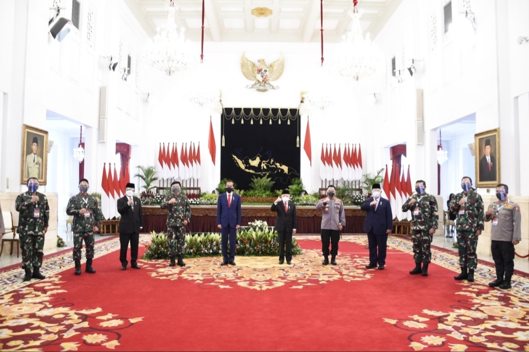 PATROLI BINS, JAKARTA - Sebanyak 180 Perwira Tinggi TNI-Polri se-Indonesia menerima pengarahan dari Presiden RI Ir. H. Joko Widodo yang didampingi Wapres RI KH. Ma’ruf Amin, Panglima TNI Marsekal TNI Hadi Tjahjanto, S.I.P., dan Kapolri Jenderal Pol. Drs. Listyo Sigit Prabowo, M.Si., pada acara Rapat Pimpinan (Rapim) TNI-Polri tahun 2021 yang melalui virtual, bertempat di Istana Negara Jalan Medan Merdeka Barat, Jakarta Pusat, Senin (15/2/2021).